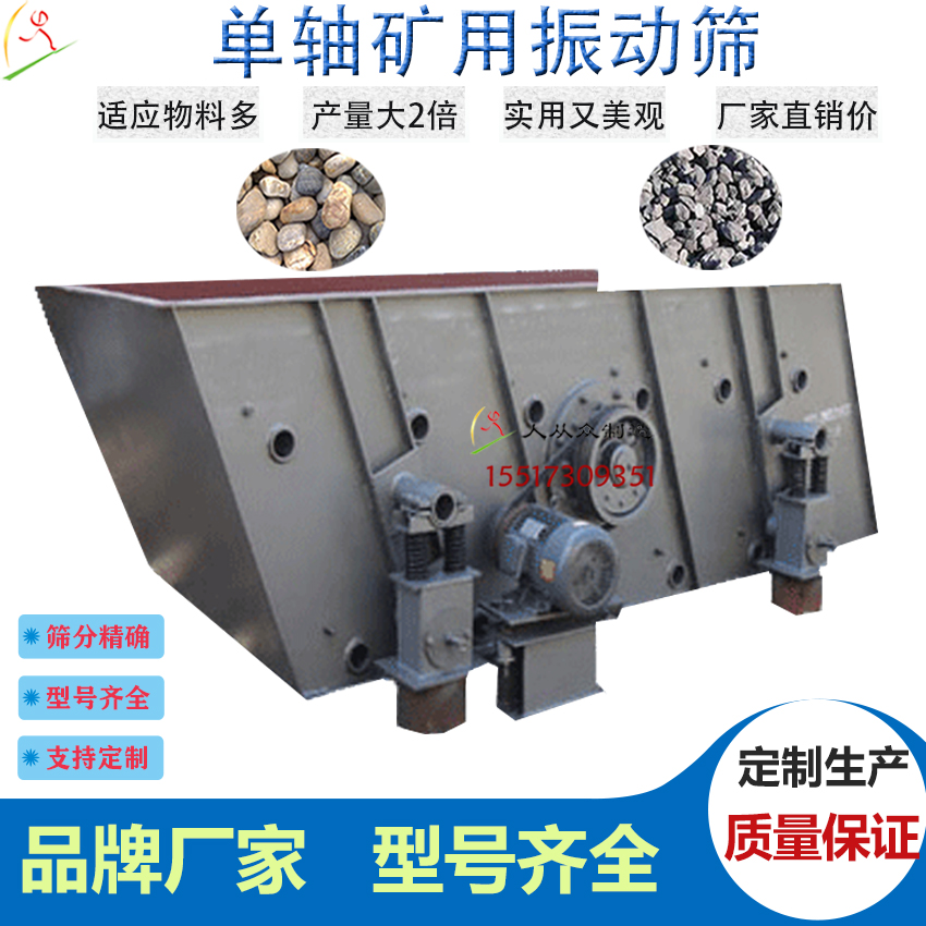 单轴矿用筛有吊式和座式,层数有单层和双层,传动形式分左右,筛板有冲孔、编织(其中还有橡胶筛网),订货须注明筛板结构筛孔尺寸。